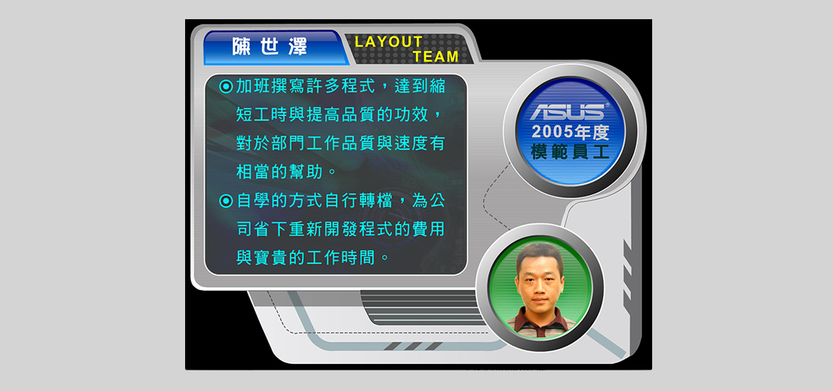 My main role at ASUSTek Computer Inc. was to create animated electronic announcemnts to be displayed on the big plasma tv screens inside their head office in Taipei Taiwan. Announcements such as global awards that the company has won, model employees, statistic charts and graphics or anything that could cheer up the team spirit of the whole company were my subject matters for the animation.