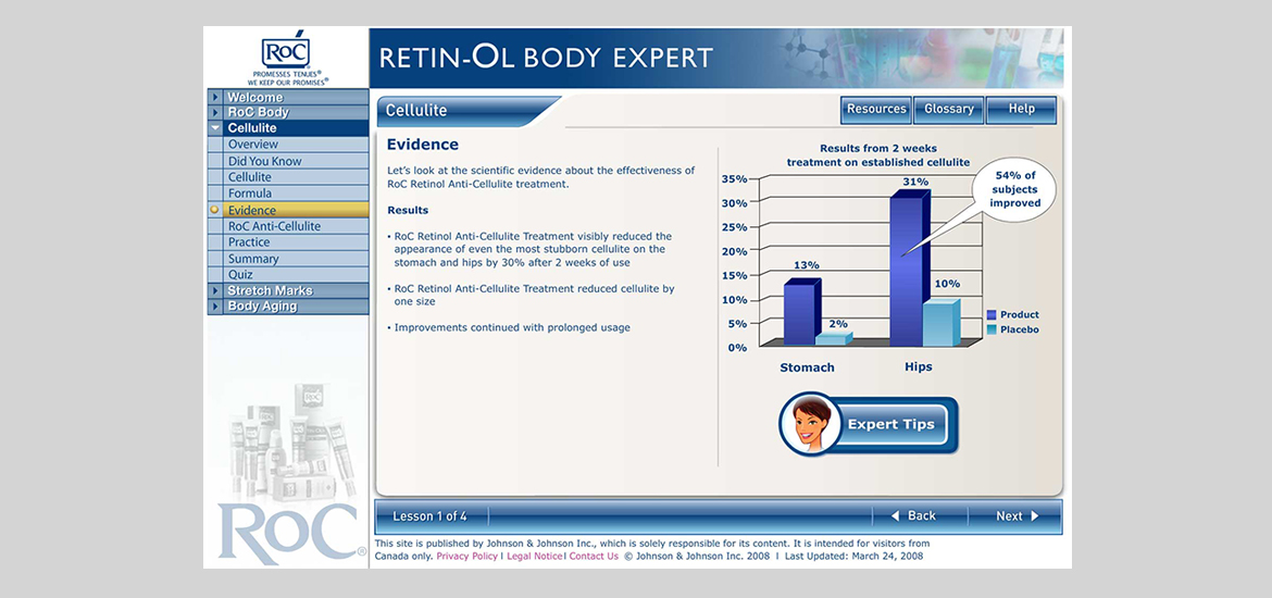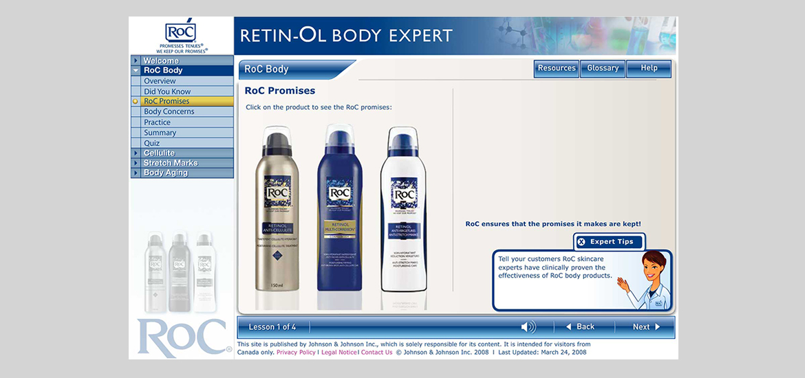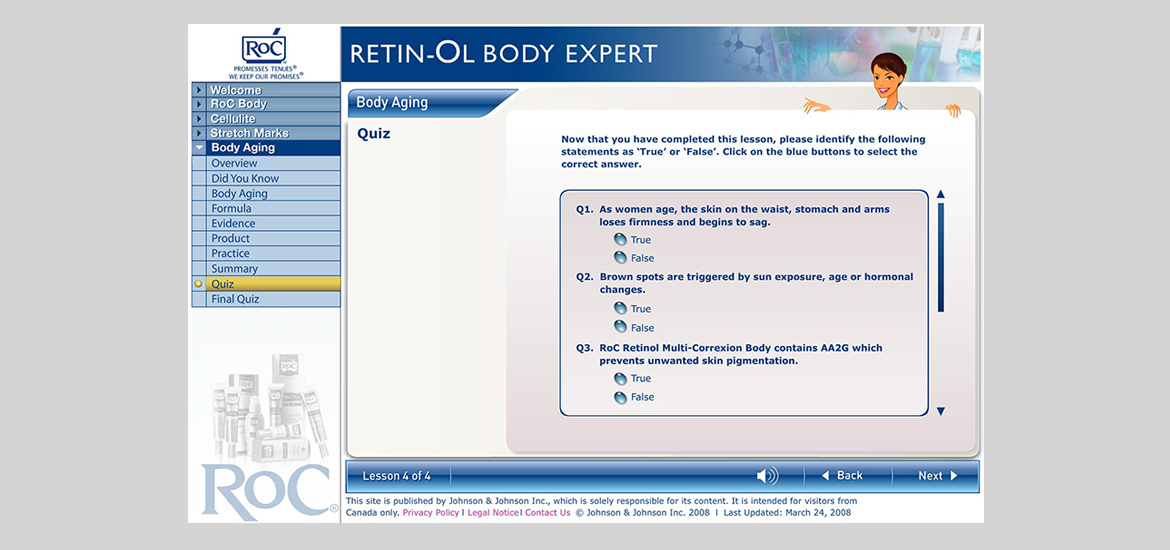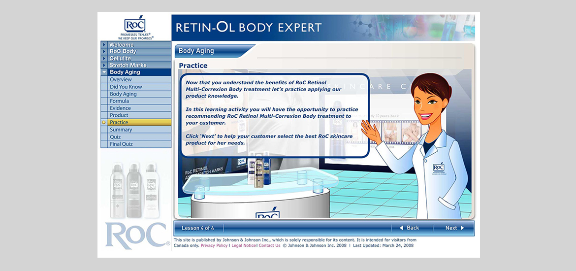 This is a Flash e-learning application project that I built entirely on my own when I was working for JAV Group. Ltd. Our client was Johnson & Johnson. This app. was designed to train sales reps understanding the RoC Rotinol Ani-aging skincare products.