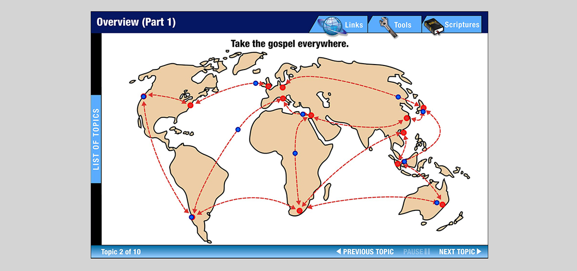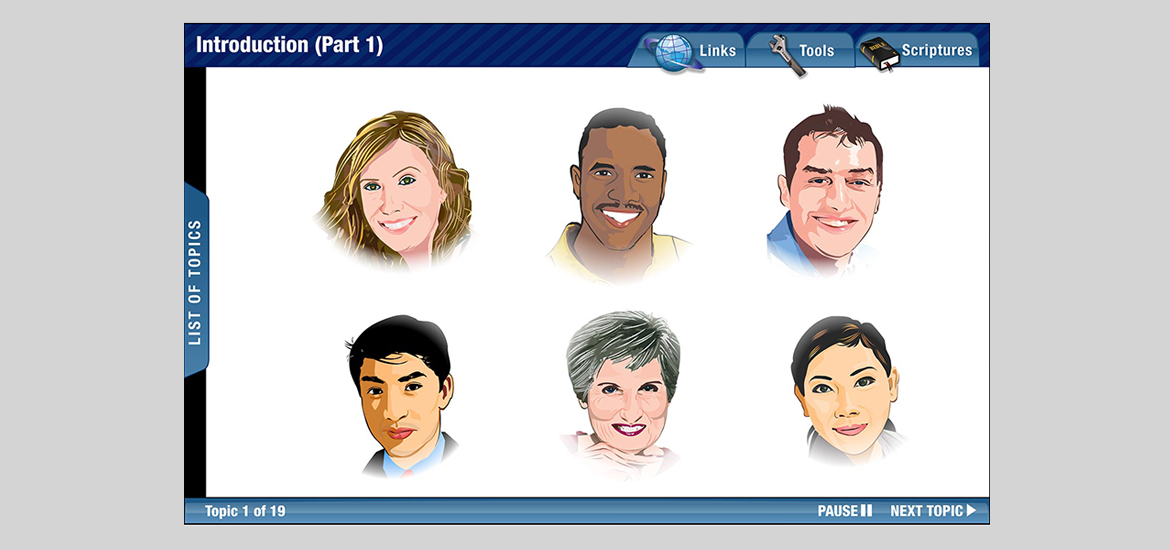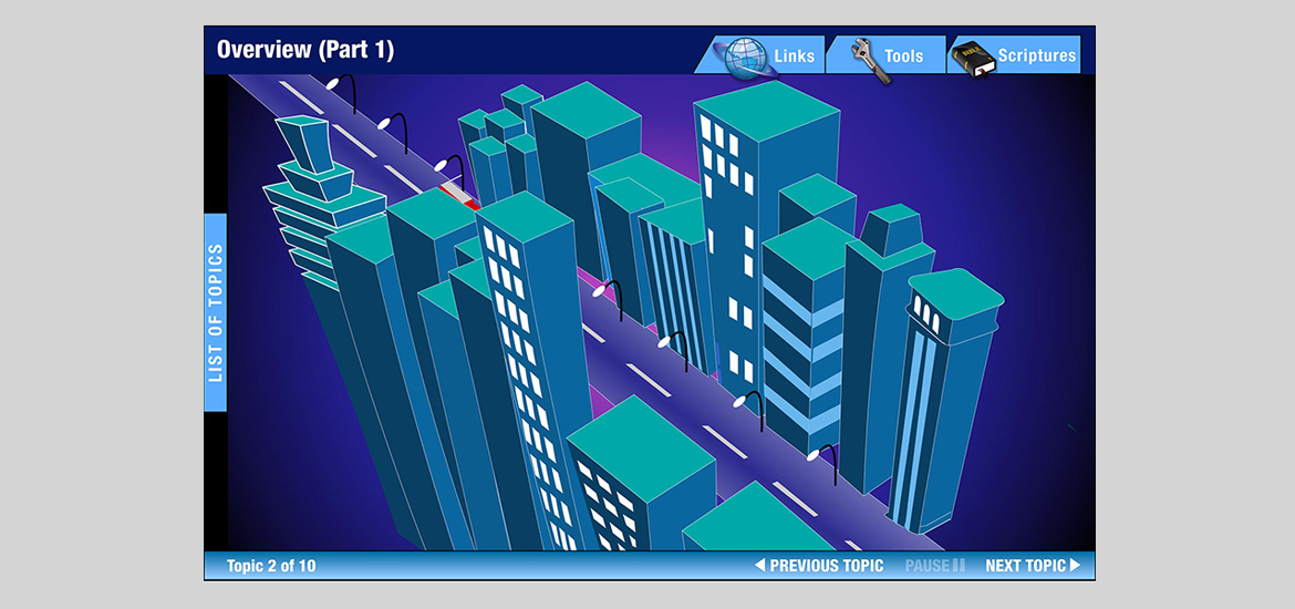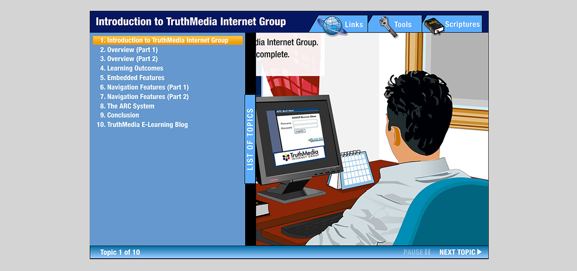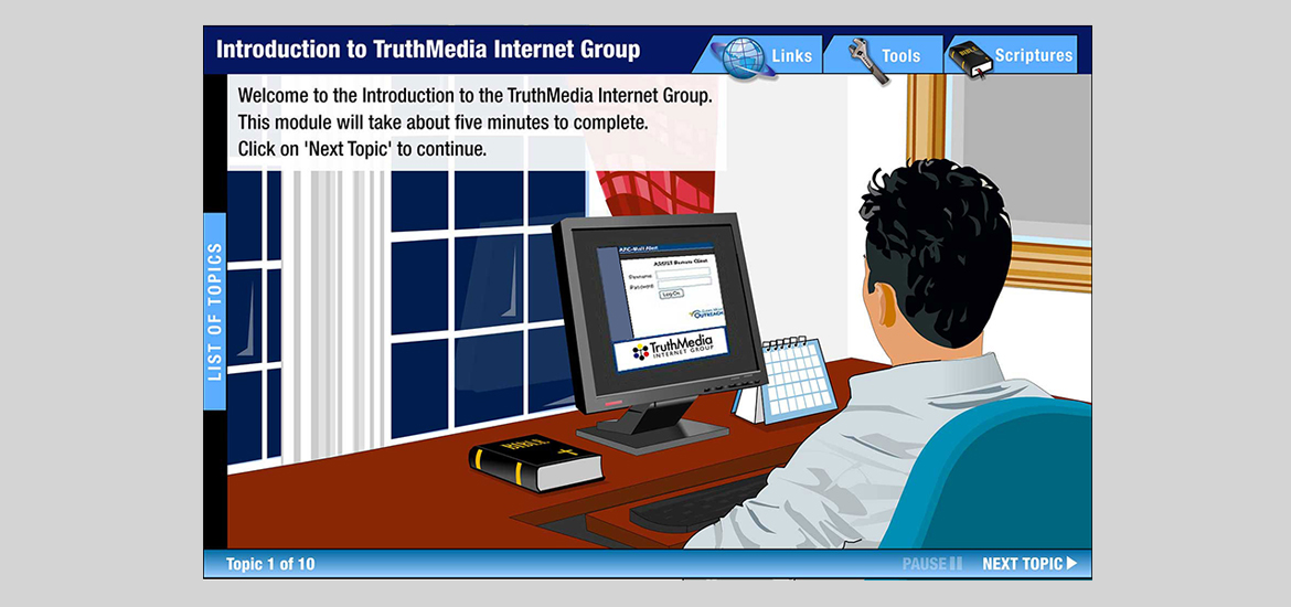 This is a Flash e-learning application project that I was involved with when I was working for Pettit Inc. Our client was an online religious media company who produce e-Learning apps for Christian communities worldwide. This e-learning app was designed to train christians how to be an online mentor to others who were seeking helps through some online services that Truthmedia provided. I was reponsible to design and animate the graphic contents of this application. I also helped to build some of the UI elements using Actionscripts.