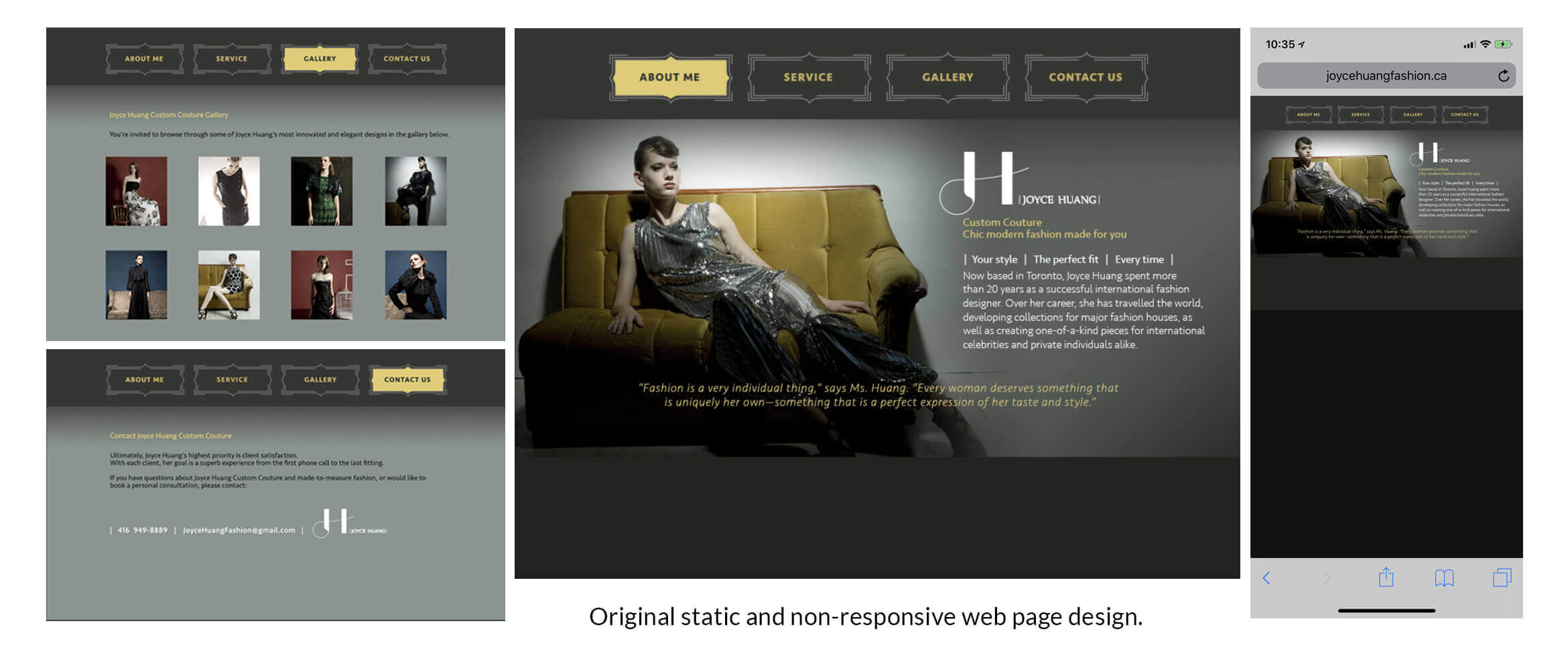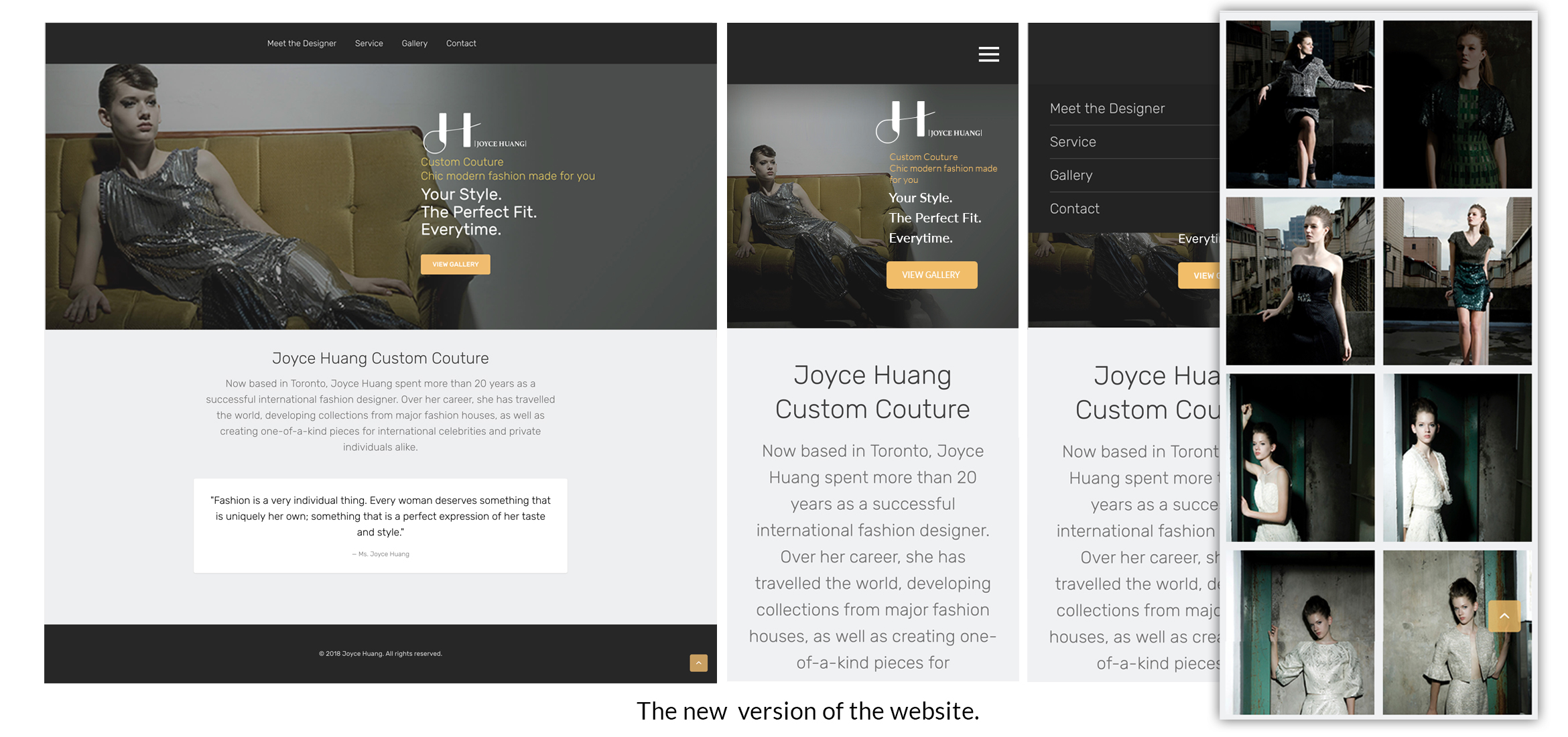 Joyce Huang is a fashion designer based in Toronto Ontario Canada, she'd like to have a little website of her own that contains a brief introduction of her business with a little online gallery showcasing her fashion design collections. She favors design style that aligns with the principle of simple and elegance design concept. For this reason, she has specifically asked not to put on too much decorative elements around her website, including her own portrait photo.