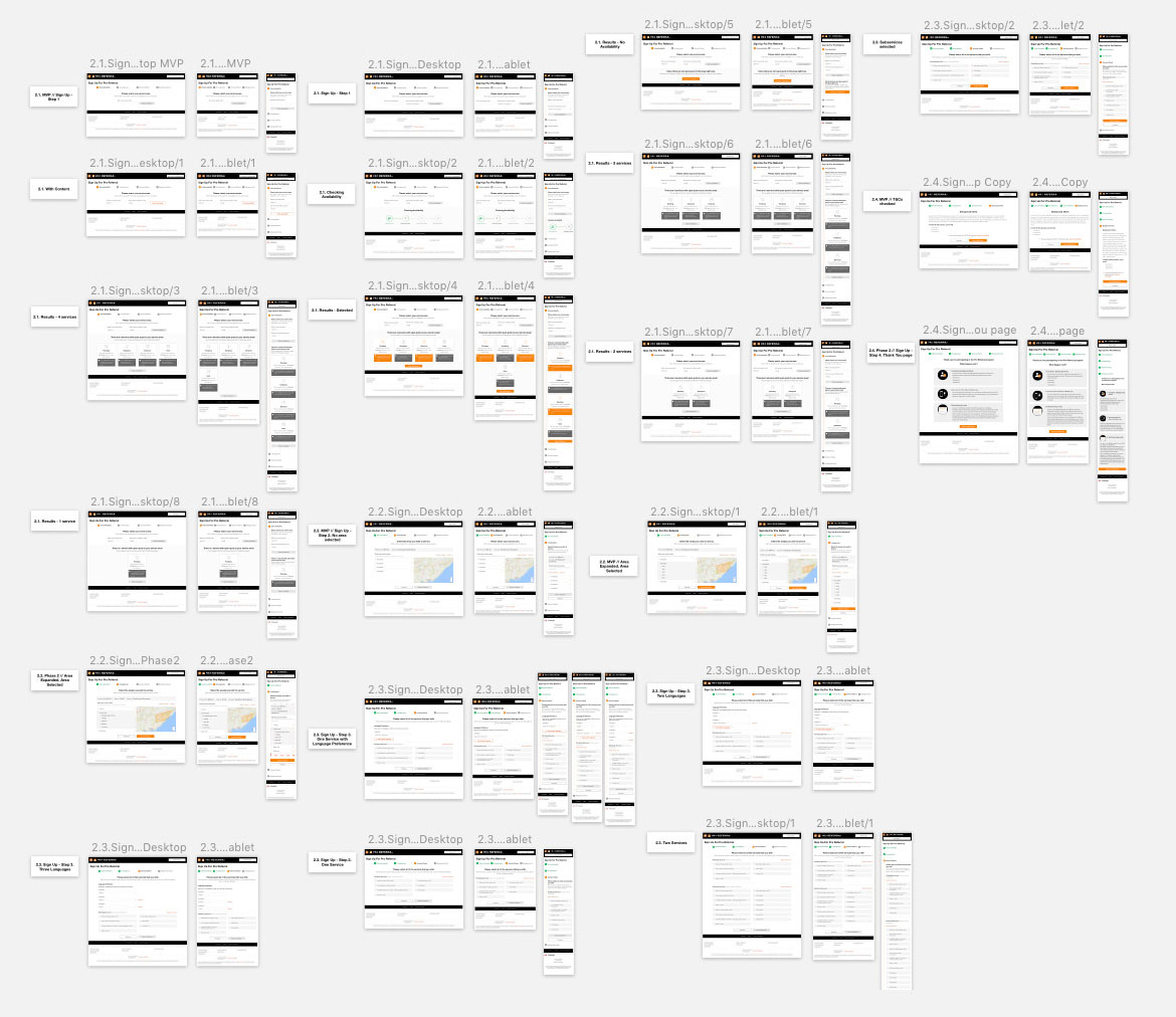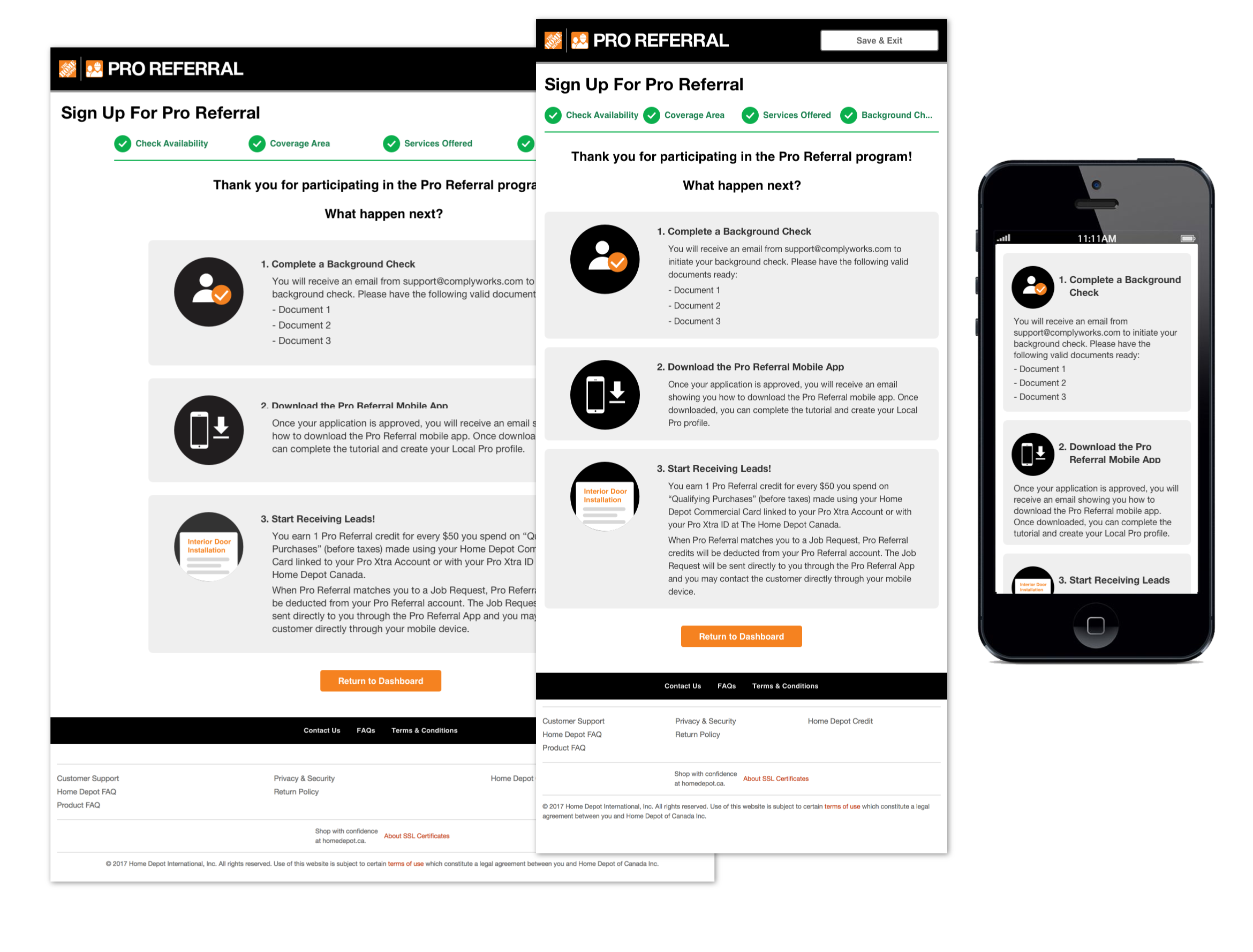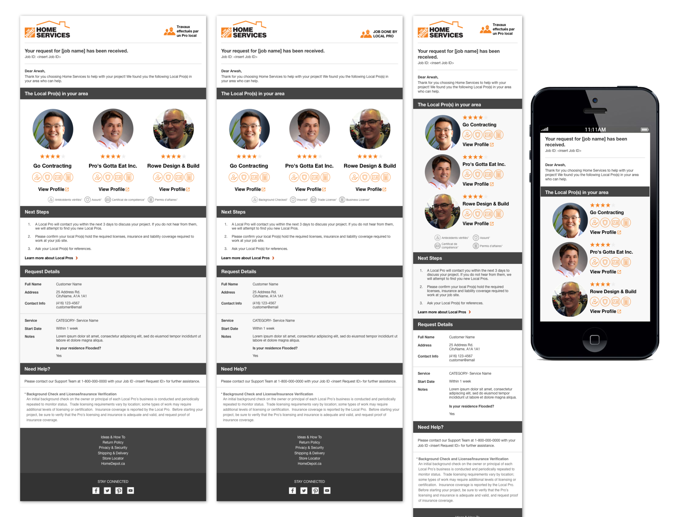 As a UI Designer at Home Depot Canada's E-Commerce department, I am responsible to create high fidelity mockup screens for Home Depot's ecommerce websites. For instance, this picture is about 8% zoomed out screen of the original screen size, it shows some examples of web UI mockups that I have done in Sketch software for Home Depot's ProReferral program sign-up flow. Each section of the mockup symoblizes a unique senario when user is interacting with the website. Each senario will be designed and created into 3 different break points for different device screens. These device screens are desktop, tablet and mobile phone screens.