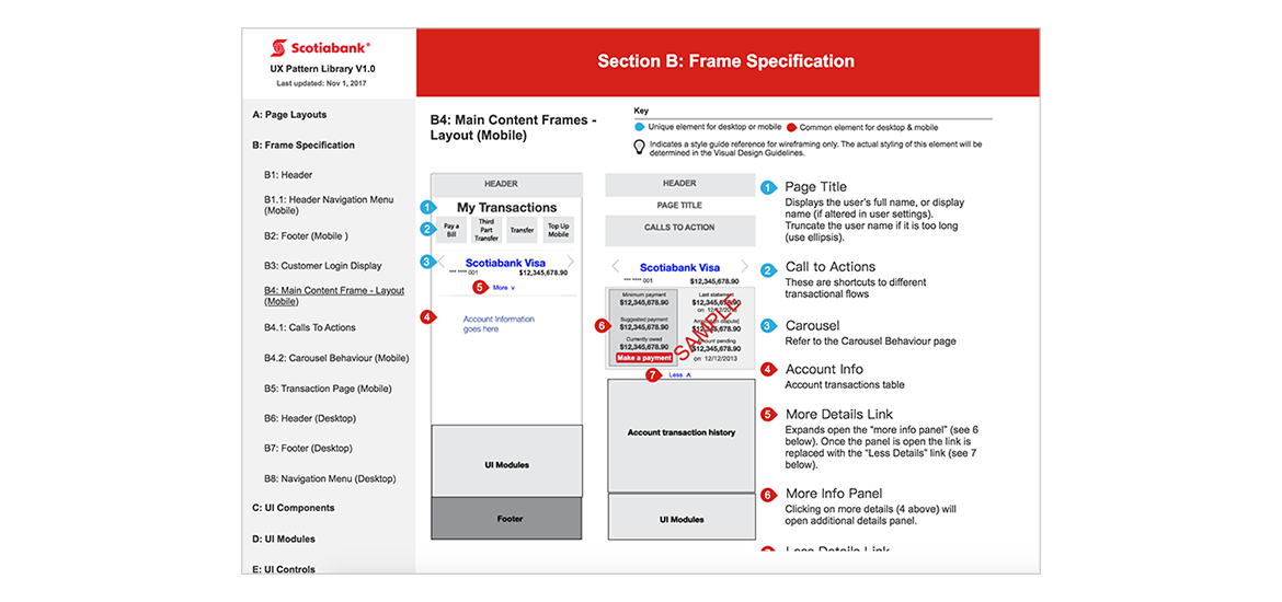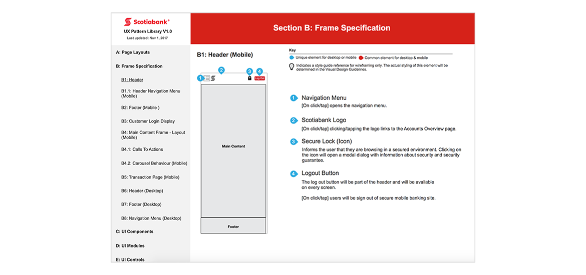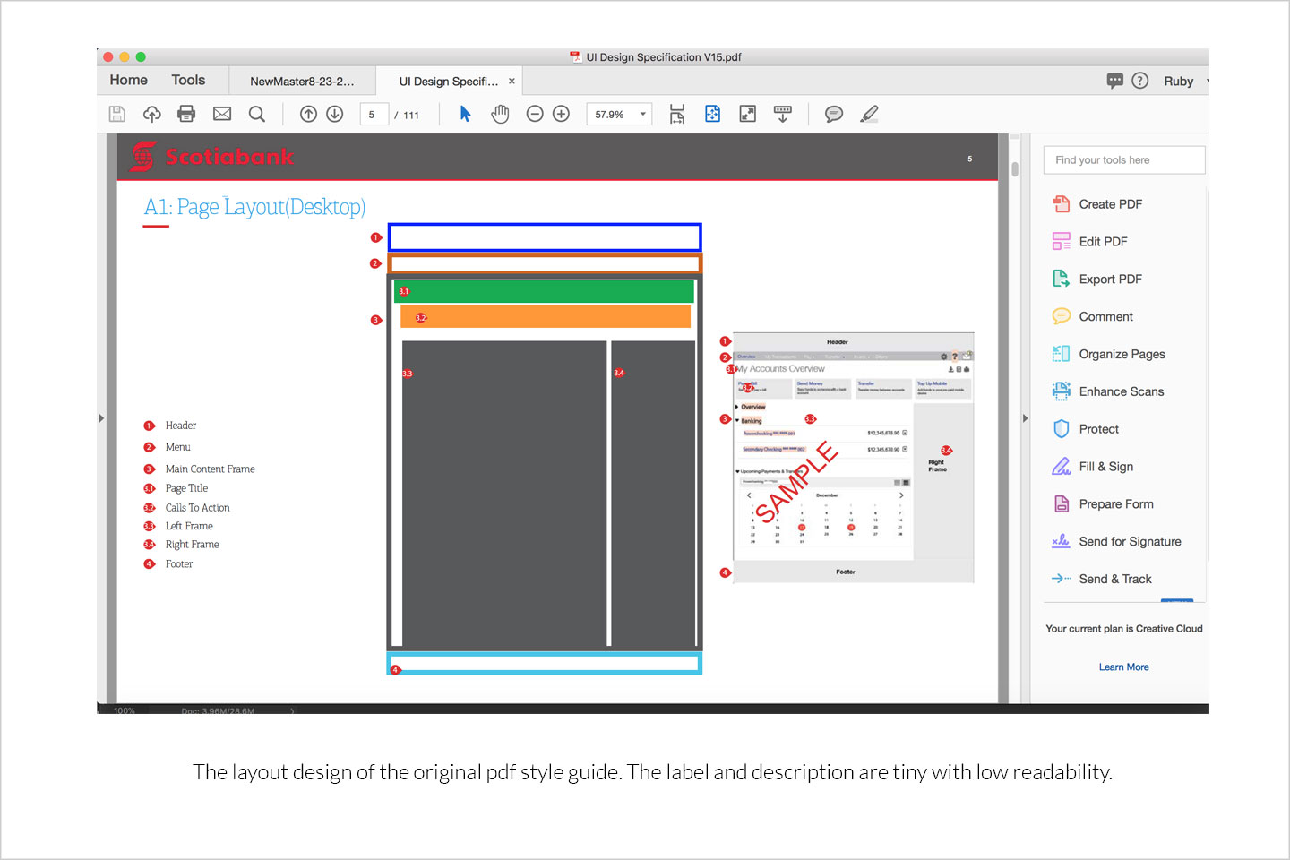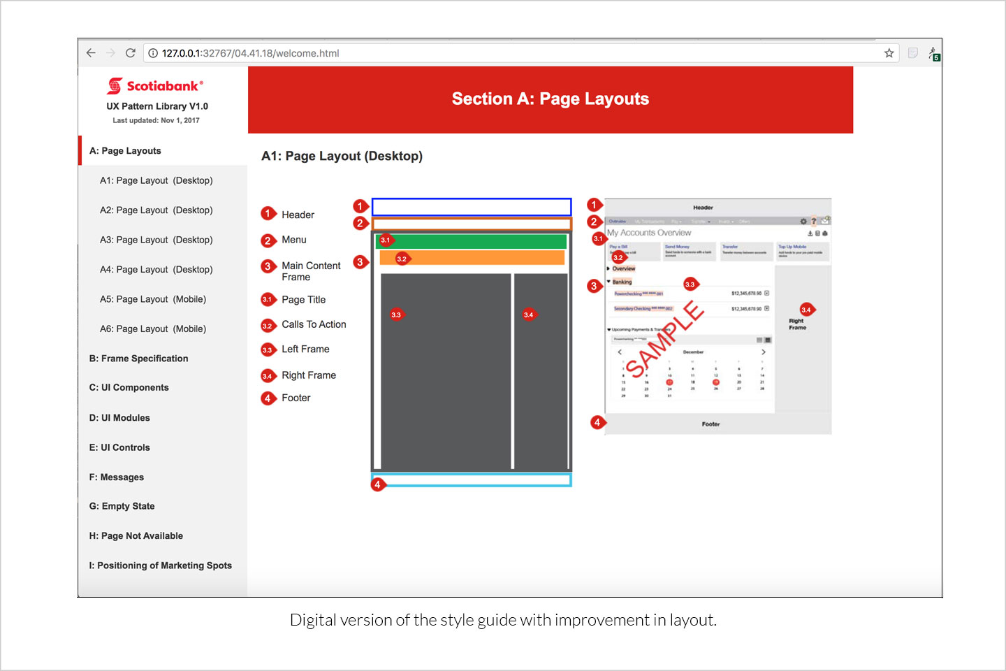 As a result, we have successfully completed the whole interactive online UI guide, in which consist of 93 pages within 2 weeks of time. This website is now hosted in Scotiabank's internal website and the Axure RP template that I have created will be uterilized to help digitizing other UI style guide as well.