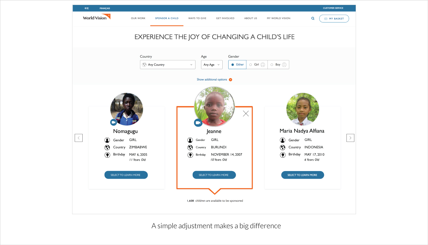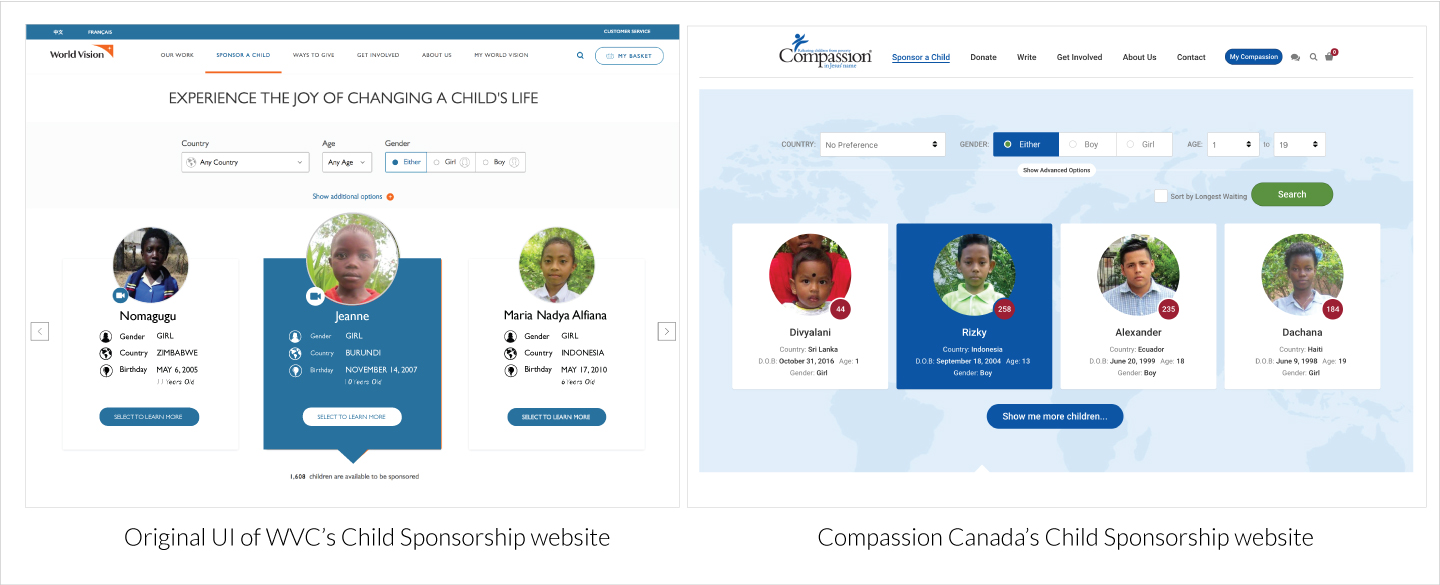 World Vision Canada's Child Sponsorship website UI was able to distinguish themselves from their look-a-like style seen from Compassion Canada's corporate website.